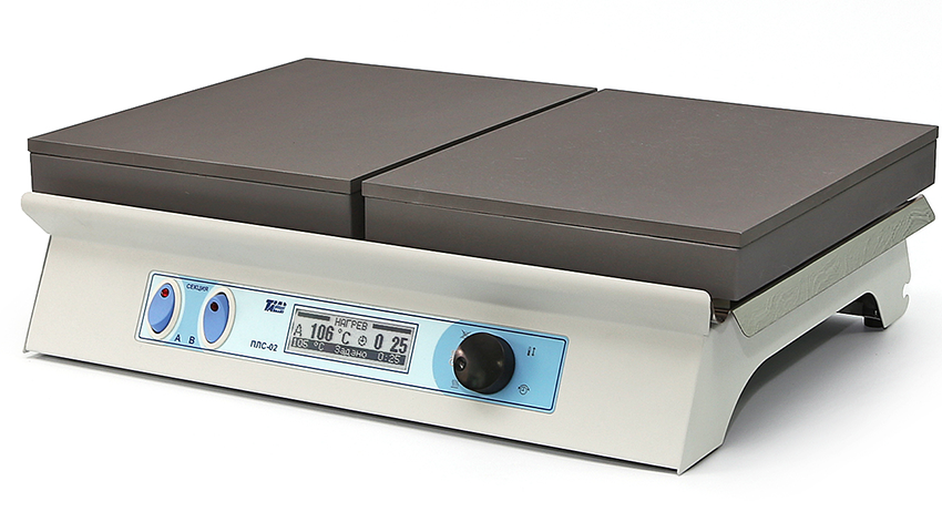 Плита нагревательная лабораторная секционная ПЛС-02 имеет две секции нагрева. Каждая секция нагрева может работать отдельно или совместно. При совместной работе секций температура разогрева одинакова по всей нагревательной поверхности обеих секций.